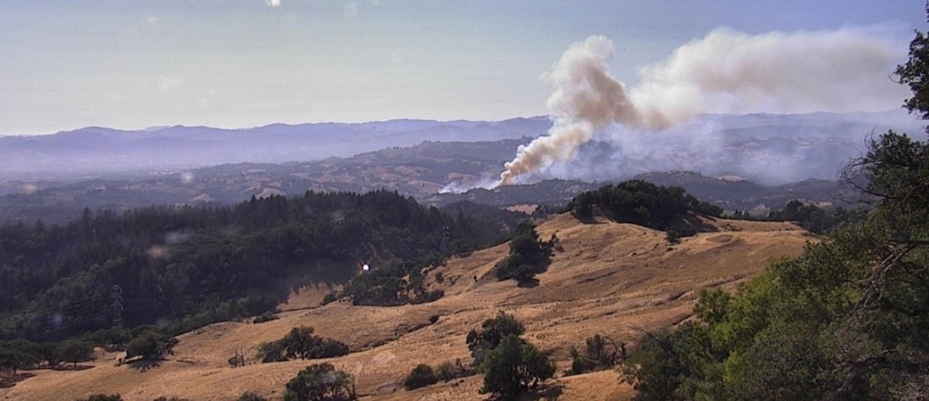 Flora’s plume, as seen from a hilltop wildfire cam nearby. (Image: Cal Fire) |